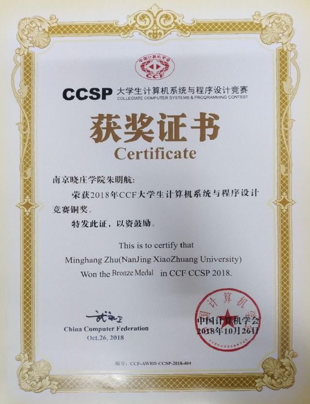 近日,由中国计算机学会(CCF)主办的大学生计算机系统与程序设计竞赛(Collegiate Computer Systems & Programming Contest,CCSP)在杭州电子科技大学落下帷幕。我校信工院朱明航、赵鹏宇两位同学参赛。经过12小时艰苦鏖战,朱明航同学斩获铜奖一项。