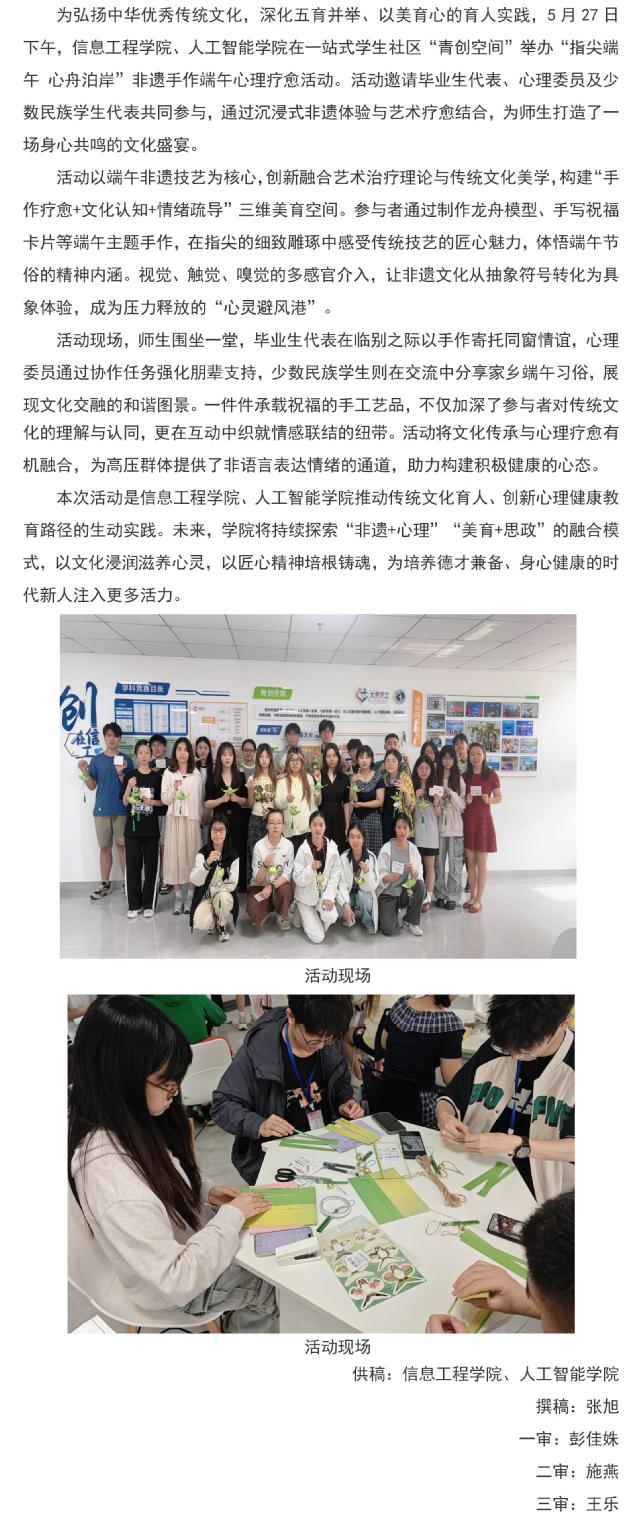 信息工程开元官方网站、人工智能开元官方网站举办“指尖端午 心舟泊岸”非遗手作心理疗愈活动——非遗技艺融美育 传统文化润心田