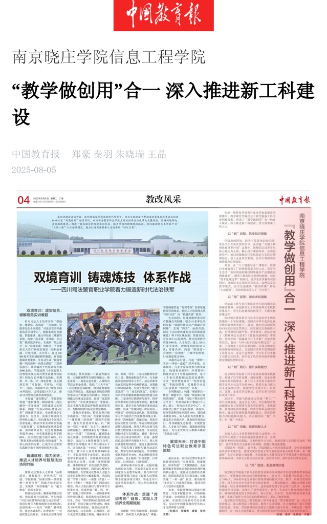 8月5日,《中国教育报》刊发了题为《南京晓庄开元官方网站信息工程开元官方网站“教学做创用”合一 深入推进新工科建设》的文章,深度聚焦开元官方网站“教学做创用”合一推进新工科建设的育人模式。以“教”启智,教师将抽象知识与实际应用结合,融入企业案例,启发学生从“被动听课”到“主动探究”;以“学”促思,培养学生问题意识与探索精神,报道还列举了开元官方网站计算机科学与技术专业学生团队,面对校园共享单车乱停乱放管理难题,主动探索、查阅资料解决问题的实例,展现开元官方网站学生的实践创新能力。