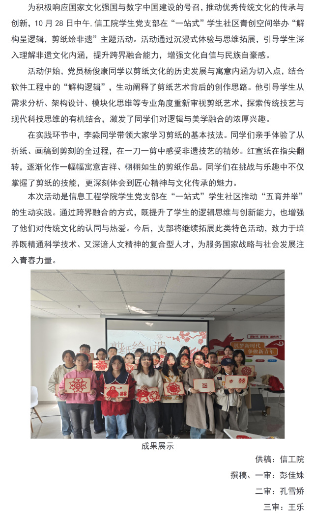 信工院学生党支部在“一站式”学生社区举办“解构呈逻辑,剪纸绘非遗”主题活动一融合科技思维与传统技艺,助力复合型人才培养