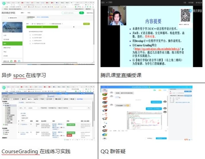 宋万里老师本学期负责《C语言程序设计》和《SoftwareDesign Pattern》两门课程,一共有4个班级的100余名学生参与学习。按学校和省在线课程群的指导,宋老师在爱课程中设置了异步SPOC让学生线上学习;安装了腾讯课堂和腾讯会议进行线上直播授课;利用CourseGrading平台发布在线练习让学生动手实践;建立了QQ群,在群里指导学生线上学习、展开作业讨论、进行答疑等。全方位360度“轰炸”,确保学生学有所获。