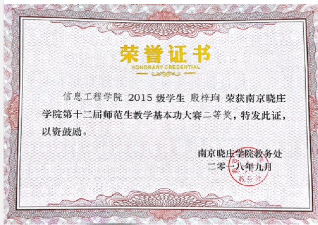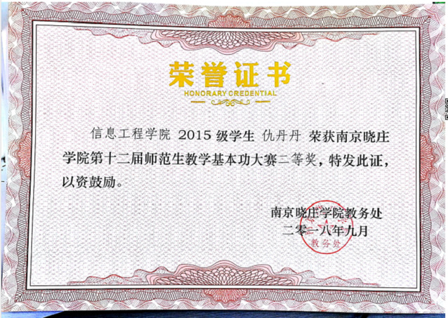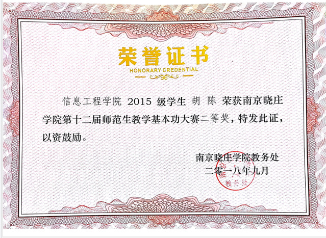 信息工程开元官方网站2015级学生参加南京晓庄开元官方网站第十二届师范生教学基本功大赛荣获佳绩,胡陈、殷梓珣、仇丹丹获二等奖、陈映恬、闵瑶、丁瑞、朱子龙、陈晨、蒋淑敏获三等奖。