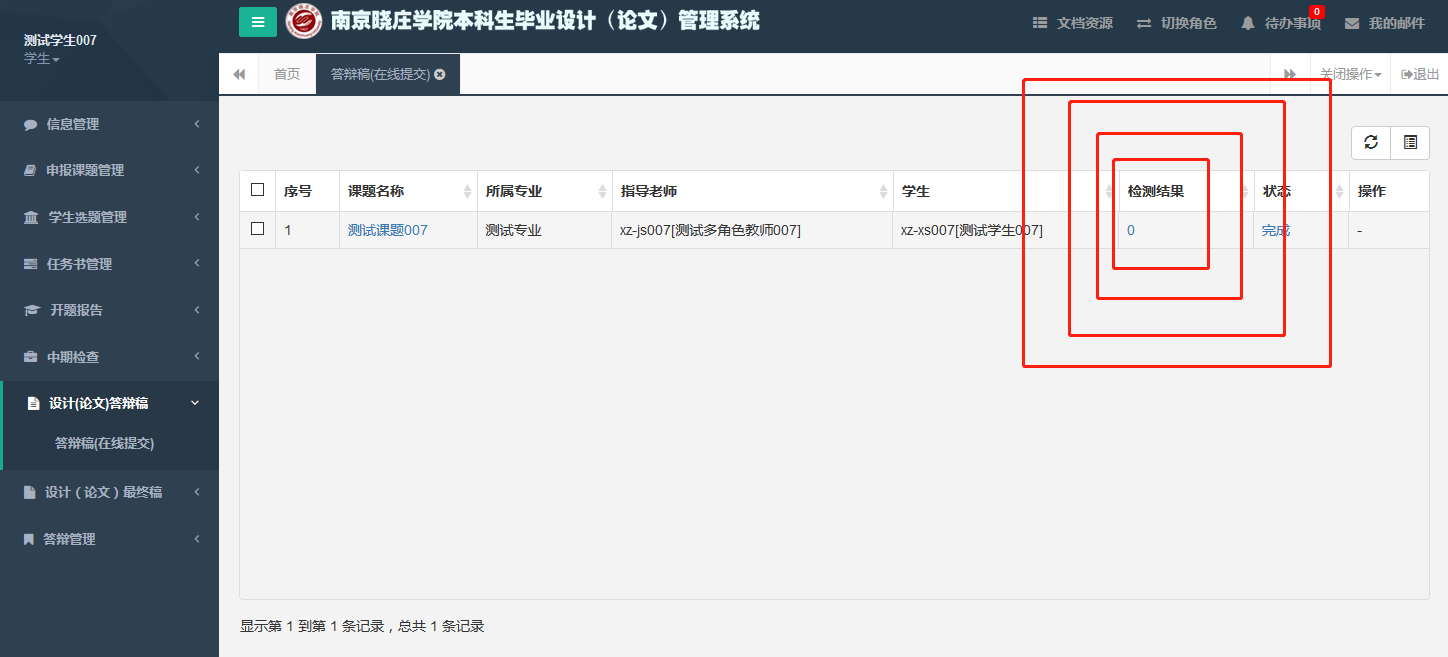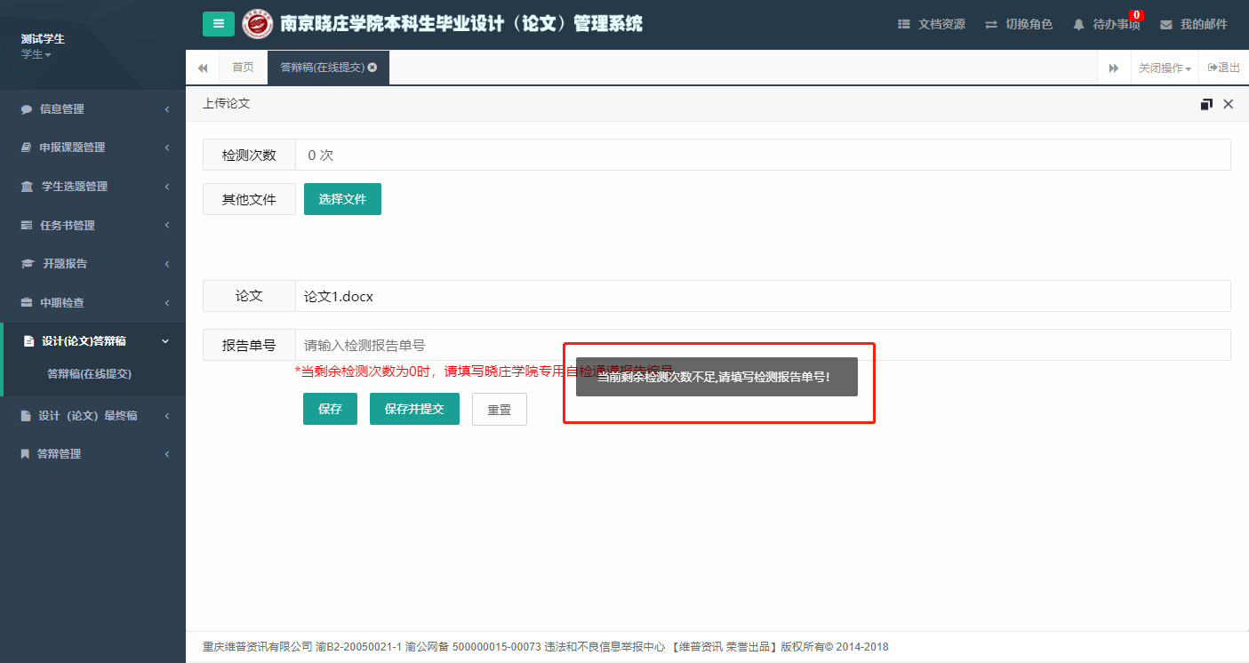“检测次数”为0时必须要填写“报告单号”,否则无法提交论文答辩稿、最终稿。