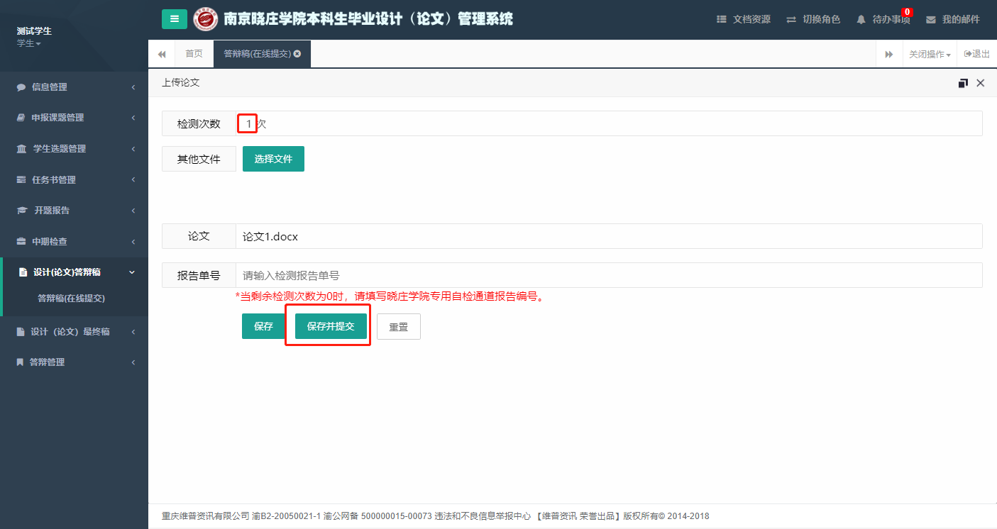 每个学生可以在答辩稿检测两次,最终稿检测一次,也就是总共有三次机会,不要在答辩稿阶段就把次数使用完了,需要留一次提交最终稿。如果没有检测次数时必须填写“检测报告单号”才可以提交答辩稿!
