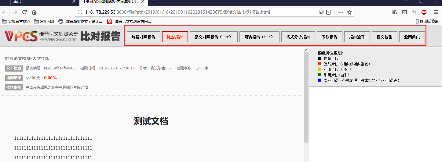 使用“检测次数”提交成功了检测结果会显示“检测中”,一般一个小时以内检测结束,并在“检测结果”呈现论文的总相似比,点击数字可以查看详细的检测报告。(学生和指导教师都是通过这个方式查看详细报告)