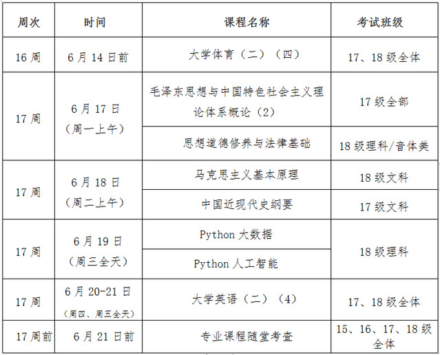 2015、2016、2017、2018级:所有课程的教学、复习、随堂考查均于第十七周(6月21日)前全部结束。考查、考试工作安排如下: