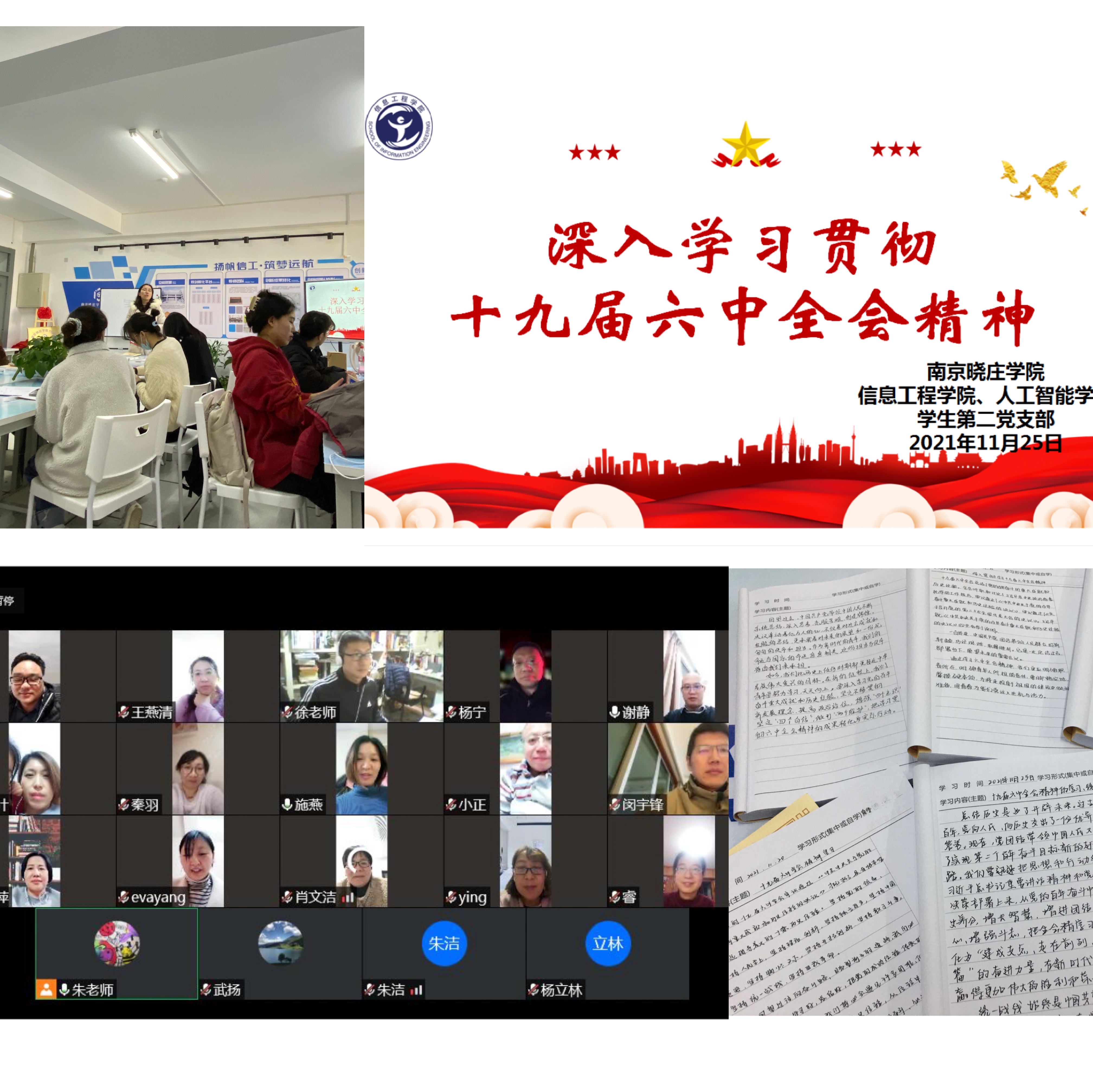 2021118日至11日,中国共产党第十九届中央委员会第六次全体会议在北京胜利召开,会议全面总结党的百年奋斗重大成就和历史经验。深入学习贯彻党的十九届六中全会精神,是当前和今后一个时期全党全国的重要政治任务。会议闭幕后,我院教工、学生党支部积极响应,通过线上、线下等方式,深入学习十九届六中全会精神,交流学习体会,营造浓厚学习氛围。