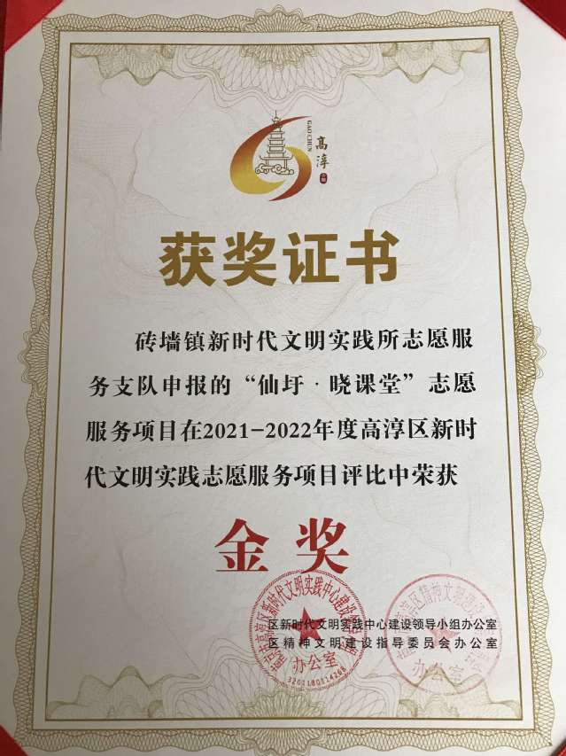 由高淳区新时代文明实践中心建设领导小组办公室、高淳区精神文明建设指导委员会办公室联合举办的高淳区2022年度志愿服务评选活动获奖名单近日公布,我院与高淳砖墙镇仙圩村合作的“仙圩·晓课堂”志愿服务项目获评金奖。