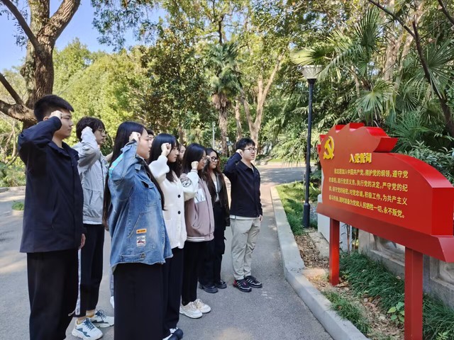 随后,党员们来到了晓庄革命烈士纪念碑,缅怀了为民族解放事业英勇献身的革命英烈。作为“晓庄十英烈”的他们,有的只有十六七岁,有的跟党员们年纪相仿,但用自己的生命诠释了信仰和忠诚,为后辈们树立了崇高的道德榜样和坚定的理想追求。站在纪念碑前,党员们无不为他们的英勇事迹所感动,更加坚定了为国家和民族的繁荣富强贡献自己力量的决心。大家再一次郑重地宣读了入党誓词,字字铿锵有力,句句刻骨铭心,红色血脉赓续绵延,初心使命历久弥坚。
