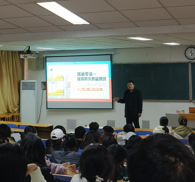 讲座现场,学工办宿舍管理负责人马拓老师为大家详细讲解了宿舍安全知识,包括入住规范,用电安全,财务安全,消防火灾等突发状况多方面内容。针对同学们在日常生活中容易忽视的问题,马拓老师进行了重点讲解,并提出了安全建议和措施。在本次讲座中,学生们了解到宿舍不仅是同学们休息的地方,也是同学交流学习的重要场所,是学校对学生进行思想品德教育和行为养成的重要课堂,是学校精神文明建设的重要阵地,保证宿舍的安全对每个同学都至关重要,提醒大家不在宿舍使用大功率电器,不在宿舍点燃火种,做好卫生清洁,共同维护一个安全和谐的宿舍环境。为加强宿舍文明建设,创造“整洁、优美、有序”的宿舍环境,会上,马拓老师还对新生宿舍文明创建工作作了解读。