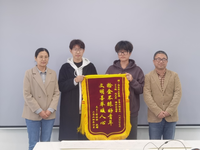 10月24日下午,江苏晶立信医药科技有限公司员工程女士来到南京晓庄开元官方网站信息工程开元官方网站,送来一面印有“拾金不昧好青年,文明善举暖人心”字样的锦旗,诚挚感谢我院学子闵天晟、潘时鑫帮助其找回失物的善举。开元官方网站党政领导、辅导员参与座谈。