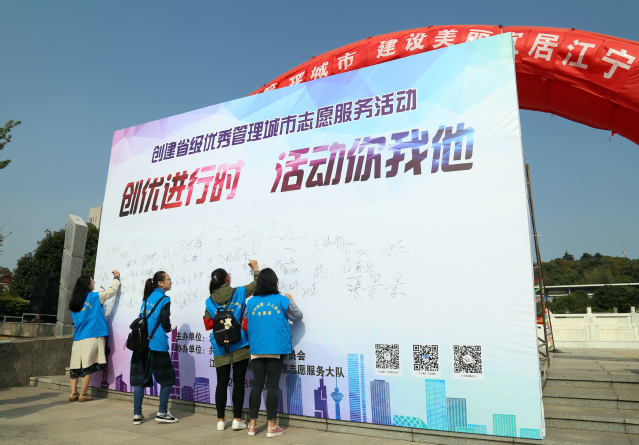 本次志愿服务活动是对江宁区主要交通路口及幼儿园、中小学校门前,对市民随意横穿马路、乱闯红灯、乱丢垃圾、乱停车等不文明行为及商家乱摆乱放、占道经营、不履行“门前三包”相关规定等违规现象进行劝阻引导。穿着蓝色马甲的大学生志愿者和城管局的志愿者们在各活动区域形成了一道道亮丽的风景线。文明引导志愿服务结束后,区城管局负责人带领我校志愿者参观了江宁区城管局监督指挥中心数字指挥平台,了解到区城管局创优工作的开展情况。随后,我校志愿者代表在天印广场宣读志愿服务倡议书,号召更多同学参与到省级优秀管理城市的创建中来,呼吁市民们自觉养成文明习惯、形成文明意识。最后,所有志愿者们进行了主题签名活动。